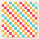 Alternating red, orange, teal, and white squares create a colorful, vibrant checkerboard pattern, conveying an energetic and playful tone.