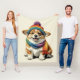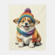 Eine weiche, gemütliche Decke mit einem bezaubernden Corgi-Welpen mit fröhlichem Ausdruck, einem lebendigen, farbenfrohen Hut und passendem Schal. Perfekt um jedem Raum Wärme und Beständigkeit zu verleihen!