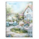 A soft, romantic watercolor illustration of a charming cottage garden scene, accented with gentle blue tones throughout. A quaint pale blue cottage with arched windows is surrounded by lush greenery, blooming pink roses, and touches of soft sky blue in the windows, shadows, and garden details. A pale stone path winds past a white picket fence into an inviting outdoor seating area, where elegant white wrought-iron chairs feature cushions in muted blue and blush stripes. Additional blue hues appear in the garden flowers and shaded foliage, adding a cool, calming balance to the warm pinks and greens. The overall palette of blues, pinks, and soft whites creates a peaceful, dreamy atmosphere—ideal for a soothing and elegant notebook cover. Personalize with your own name.