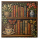 A cozy retro style book shelf with a steaming cup of coffee / tea - beautiful florals and butterflies !