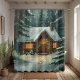 This design beautifully captures the essence of a cozy winter getaway. The watercolor-style illustration features a charming log cabin tucked among snow-laden pine trees and a softly falling snow. The warm, inviting light from the windows contrasts perfectly with the cool blue-green forest, creating a true holiday hygge vibe.