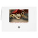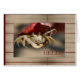 Bild einer kleinen Krabbe in einem roten Blatt, die "HELLO" sagt, oder alles, was man von ihm mit abstraktem Hintergrund sagen möchte. Ideal für Geburtstage und Abendessen. Einfach anpassen. Wahl von Standard- oder Klein-, Matt- oder Halbglanzpapier.