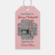Ein wunderschönes Etikett für handgearbeitete Projekte mit rosafarbenem Hintergrund hinter einer gerahmten Vignette mit Vintager Hand betriebener Nähmaschine, verzierter Kleiderform, Stickereischere und blühenden Reben. Oben und unten befinden sich 4 Textfelder "Hand-Made by", "Maker's Name", "speziell für" und "Empfängername", damit Sie sich persönlich gestalten können. Perfektes Sake-Add-on für Geschenke oder Werbung & Preisschild für Kunsthandwerk-Shows.