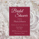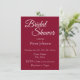 Einfache Stil, Brautduscheinladung mit einem trendigen, kranberroten Hintergrund, dem Namen und der Veranstaltungszeit der zukünftigen Braut, dem Party, dem Kontakt, etc., in weißer, stilisierter Schrift gedruckt. Personalisieren Sie Ihre Einladung, indem Sie Text durch eigene Brautparty-Informationen ersetzen. Wählen Sie Ihre Einladung Papier Stil und Quantität.