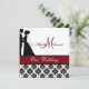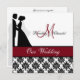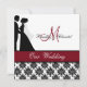 Schwarz-Weiß-Damast-Druck mit einer Cranberry-Rot-Band, eine Silhouette Braut und Bräutigam, und Bereiche, die Sie personalisieren können mit Ihren Namen, Monogramm-Ersteingabe, Hochzeitsfeier und Empfang Informationen über eine maßgeschneiderte Hochzeitseinladung, die klassisch und traditionell in einem! Scrollen Sie nach unten, um passende Hochzeitsfeiern zu Siegeln.