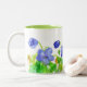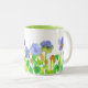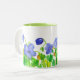 Eine hübsche, blumengeschmückte Kaffeekaffee-Tasse, die mit lila Kranichen-Wildblumen mit Aquarell mit Federgrün-Blätter und Stielen dekoriert ist.