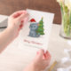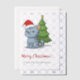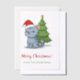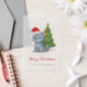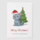 Grumpy looking grey tabby cat is wearing a red Christmas hat. Small Christmas tree behind it. Customizable text.