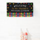 Willkommen Banner für ein Klassenzimmer personalisiert mit dem Namen des Lehrers unter bunten Sternen und über einer Reihe von Stiften in rot, gelb, grün und blau. Kindergarten Begrüßungsbanner mit bunten Stiften und Sternen vor schwarzem Hintergrund. Herzlich willkommen auf dem Banner der Schule personalisiert mit dem Namen des Lehrers in einem spielerisch roten Schriftart.