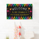 Ein personalisiertes Klassenzimmer empfängt Banner mit dem Namen des Lehrers unter lebhaften Sternen und über einer Reihe von Schluchten in einem Regenbogenverlauf. Dieses Kindergartenbanner zeigt farbenfrohe Stifte und Sterne auf schwarzem Hintergrund, wobei der Name des Lehrers in einer spielerisch gelben Schrift angezeigt wird. Herzlich willkommen in der Schule mit einem hellen und fröhlichen Banner!