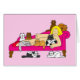 Der Cartoon einer Dame, die sich auf einer Chaislongue zurückzieht, umgeben von farbenfrohen Katzen, hat einen lebhaften rosa Hintergrund.