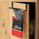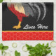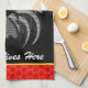 Dieses Küchentuch hat die Meldung "Crazy Chicken Lady Lives Here" mit Memphis-Hahn auf schwarzem Hintergrund mit roten Hühnerdrahträndern. Personalisieren Sie dies mit Ihrer eigenen Nachricht. Sie können auch Schriftart und einige Farben bei der Anpassung ändern.