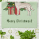 Desteis originelle Cartoon Illustration einer niedlichen englischen Creme Farbe Labrador Retriever Rasse Hund. Der Hund wird von einem festlichen Weihnachtsbaum stehend, der mit roten und gelben Ornamenten verziert ist, einer Perlgarage und einem gelben Stern, der auf dem Baumgipfel steht. Es gibt auch zwei Geschenke vom Baum umwickelt und hinter dem Hund gibt es ein braunes Regal mit zwei Kerzen. Die Hintergrundfarbe ist hellgrün, und es gibt auch einen personalisierbaren Textbereich, der nun lautet: "Frohe Weihnachten!".