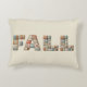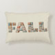 Ein gemütliches dekoratives Kissen mit dem Wort "FALL", das in fett gemusterten Imitaten mit gepolsterten Patchwork-Buchstaben geschrieben ist. Jeder Buchstabe besteht aus verschiedenen Stoffmustern in warmen Herbsttönen wie Orange, Braun, aquamarin und Creme, was ein rustikales Bauernhaus und saisonale Atmosphäre schafft.