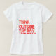 Mit diesem inspirierend "Think Outside The Box"-T - Shirt können Sie Ihre Kreativität entfalten! Dieses Tee aus weichem, atemberaubendem Stoff für den ganzen Tag Komfort, mit fett roten Schriftzeichen auf einem klassischen weißen Hintergrund, der eine Aussage ohne Sprichwort zu einem Wort macht. Ideal für Künstler, Innovatoren und alle, die es wagen, groß zu träumen.