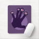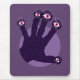 Horror-Mousepad mit einer seltsamen digitalen Abbildung einer dunklen Palme mit Fingern, die in Augenbrauen enden, mit rosa Reisen und weißen Wimpern, die einen über lila Hintergrund beobachten.