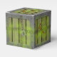 Eine Karikaturenkiste aus grauem Holz mit gepolsterten Metallkanten, umwickelt in rostigen Ketten, die von einem Schloss verschlossen sind, und eine grüne giftige, leuchtende Wolke, die zwischen den Brettern austretet. Es hat einen anpassbaren roten Text auf der Oberseite und auf den Seiten. Spaß für Ihr Halloween-Party oder Rollenspiel!