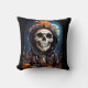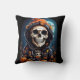 Ein Kopfkissen mit einer Skelettabilderung, die eine Kapuzenjacke mit einem orangefarbenen Hexenhut trägt. Ein leuchtender Mond im Rücken mit einem Single-Fledermaus, der in der Nähe fliegt. Spaß Halloween Design.