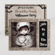 Creepy Halloween-Party Einladungen. Spooky kleines ethnisches Kindergespenst mit großen beängstigenden Augen, die super erschreckende Puppen halten.