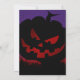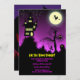 Ein beängstigendes Spuk Haus, das auf einem Hügel mit einem Friedhof an einem dunklen lila Himmel steht. Es gibt einen Vollmond mit einer bösen Hexe, die darüber fliegt. Sehr lustiges und beängstigendes Design für Ihre Halloween-Party-Einladungen.