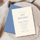 the front design shows a classic minimal elegant 30th birthday invitation in dusty blue typography with creme background.