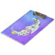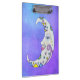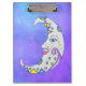 Diese Zwischenablage hat einen weißen Halbmond mit hübschem Gesicht mit blauen Augen und rosa Lippen. Es ist mit farbenfrohen abstrakten Markierungen in blau, gelb und lila, zusammen mit Sternen auf einem lila Himmelshintergrund auf der Vorder- und Rückseite dekoriert.