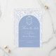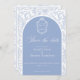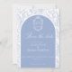Delft blue floral save the date card, designed in a refined blend of chinoiserie and French toile de Jouy style. The soft botanical illustrations frame an arched layout featuring an elegant wedding crest monogram, perfect for couples who love vintage, historic, and European-inspired aesthetics. Classic script typography pairs beautifully with the ceramic-blue palette, making this design an effortless nod to the tradition of “something blue.” Fully customizable with your names, date, and location, it’s an exquisite choice for any romantic or sophisticated wedding theme.