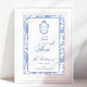 Delft blue floral table number card, designed in a refined blend of chinoiserie and French toile de Jouy style. The soft botanical illustrations frame an arched layout featuring an elegant wedding crest monogram, perfect for couples who love vintage, historic, and European-inspired aesthetics. Classic script typography pairs beautifully with the ceramic-blue palette, making this design an effortless nod to the tradition of “something blue.” Fully customizable with your names, wedding crest and in this design table number: Ten, it’s an exquisite choice for any romantic or sophisticated wedding theme.