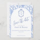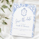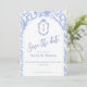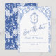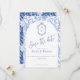 Delft blue floral save the date card, designed in a refined blend of chinoiserie and French toile de Jouy style. The soft botanical illustrations frame an arched layout featuring an elegant wedding crest monogram, perfect for couples who love vintage, historic, and European-inspired aesthetics. Classic script typography pairs beautifully with the ceramic-blue palette, making this design an effortless nod to the tradition of “something blue.” Fully customizable with your names, date, and location, it’s an exquisite choice for any romantic or sophisticated wedding theme.