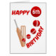 Dieses Design hat eine Illustration eines Cricket-Schlägers, von Bändern und Ballen. Der Ball ist seit sechs Jahren getroffen. Das Design kann mit einem Cricket-Liebling des Geburtstags und Namens angepasst werden. Ein personalisiertes Cricket-Design für Kindergeburtstage.