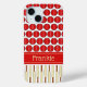 Cricket Bälle erzeugen ein helles Polka Punktmuster auf weißem Hintergrund auf diesem sportlichen Handygehäuse. Cricket-Fledermäuse werden auch in einem komplementären Muster verwendet. Ein rotes Band hat Platz, um einen Namen oder einen anderen Text zu personalisieren.