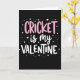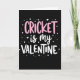 This card features a deep black background with the message “CRICKET is my VALENTINE” centered in three lines, creating a sleek, high-contrast look. “CRICKET” sits on the top line in rounded bubblegum pink letters that feel like an excited shout of affection 🥰. Just below it, “is my” appears in thin white cursive lettering, adding a softer, closer-to-the-heart touch. “VALENTINE” anchors the bottom line in strong white letters that mirror the top word’s shape and weight, making the whole layout feel balanced ❤️. Around the text, small white dots are sprinkled like confetti, giving the scene a celebratory sparkle without crowding the message. Tiny white hearts float among the dots, hinting at a sweet connection between sports pride and romance through the way they cluster near the words. The decorations stay light and airy, with the hearts and dots most noticeable near the upper and side edges of the centered text.
