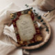 An opulent celestial invitation adorned with deep crimson tones, gilded constellations, and baroque astronomical motifs. Perfect for evening weddings, gothic romance themes, or celestial-inspired celebrations, this design captures the majesty of the cosmos and the timeless elegance of vintage starlight art.