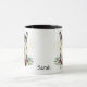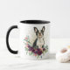 Ein wunderschönes Aquarellporträt eines schwarz-weißen Boston Terrier Hundes entsteht aus einem knallroten und rosa Bouquet auf dieser Tasse. Hinter dem Hundebild steht ein Spray aus goldenen Konfetti. Das Bild erscheint auf zwei Seiten der Tasse, wobei Ihr Name schwarz zwischen ihnen ist. Wenn Sie es vorziehen, können Sie den Text entfernen, indem Sie das Vorlagenfeld löschen.