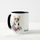 Ein wunderschönes Aquarellportrait eines trifarbigen Cardigan Welsh Corgi Hundes entsteht aus einem knallroten und rosa Bouquet auf dieser Tasse. Hinter dem Hundebild steht ein Spray aus goldenen Konfetti. Das Bild erscheint auf zwei Seiten der Tasse, wobei Ihr Name schwarz zwischen ihnen ist. Wenn Sie es vorziehen, können Sie den Text entfernen, indem Sie das Vorlagenfeld löschen.