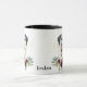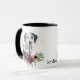 Ein schönes Portrait eines Dalmatiner-Hundes entsteht aus einem knallroten und rosa Bouquet auf dieser Tasse. Hinter dem Hundebild steht ein Spray aus goldenen Konfetti. Das Bild erscheint auf zwei Seiten der Tasse, wobei Ihr Name schwarz zwischen ihnen ist. Wenn Sie es vorziehen, können Sie den Text entfernen, indem Sie das Vorlagenfeld löschen.