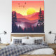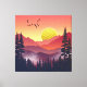 Eine abstrakte Landschaft einer Bergszene mit einem Sonnenaufgang und Bäumen in kühnen Schattierungen und Rot.