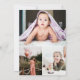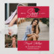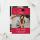 Doppelseitige Abschluss-Save the Date-Karte mit Typografie-Design und einem Foto des Absolventen in hellen Rottönen. Fügen Sie drei weitere Fotos in einer sauberen Collage auf die Rückseite. Abschluss Save the Date Vorlagenkarte personalisiert mit Fotos.