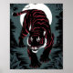 majestätischer schwarzer Tiger mit auffallenden roten Streifen. Der intensive Blick der Kreatur und die posierte Haltung rufen ein Gefühl von Power und Rätsel hervor.