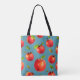 Dieses Design zeigt rote Äpfel in einem Muster auf blauem Hintergrund.