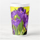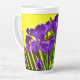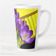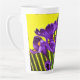 Mehrere lila Crocuses, die Vorboten des Frühlings, auf einem geometrischen schwarz-gelben Hintergrund. Die orangefarbenen Diagonalstreifen und die grünen Blätter sorgen für ein VIBRANT-Design, im behalt zu den Kompositionstheorien und der Verwendung des Farbrads!