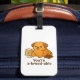 Ein lustiges Gepäckanhänger mit einem Croissant-förmigen Hund mit Schokolade- und Mehlakzenten. Ideal für die Dekoration von Laptops, Notebooks oder Wasserflaschen