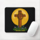 Cross with Crown of Thorns around it, religious mouse pad. Personalized name/date, bright yellow sun in background with purple and yellow flowers. Black, brown, yellow, and green. John 3:16 printed on cross.