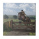 Dieses Tile zeigt ein originelles digitales Kunstwerk eines Pferdes und Reitens, das über ein Tor eines Bauernhofs hüpft und von dem Künstler Jayne Wilson in Vue erstellt wurde.