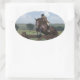 Dieser Oval Sticker ist mit einem originalen digitalen Kunstwerk eines Pferdes und Reitens, das über ein Tor eines Bauernhofs springt, gestaltet von Jayne Wilson in Vue.