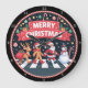 Dies ist ein lustiges, kreisförmig-gerahmtes Grafikdesign mit einem Urlaubsthema. Das zentrale Bild zeigt Santa, ein Rentier, einen Lebkuchenmann und einen Schneemann, der über eine Kreuzung spaziert. Darüber steht ein festlich roter Banner in fett weißen Buchstaben "MERRY CHRISTMAS". Der Hintergrund ist ein dunkler Nachthimmel voller Schneeflocken, Sternen und hängenden Weihnachtsdekorationen wie Bonbons und Ornamente. Der äußere Rand ist ein roter und weißer Canetstreifen. Die Ästhetik ist insgesamt fröhlich und skurril, was sie perfekt für die Ferienzeit macht.