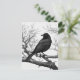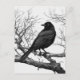 Postcard in Schwarz-Weiß-Abbildung mit einer schwarzen, schwarzen Krähe, die auf einem gerissenen, geröteten Zweig steht. Die detaillierten Federn des Vogels stehen in scharfem Kontrast zu den krassen, skelettalen Baumgliedmaßen, was zu einer dramatischen Komposition führt.
