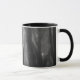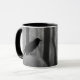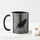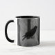 Crow in Monochrom in der Mitte von Bäumen auf der Kaffeetasse eines Krähenliebhabers.