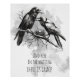 Schwarz-weiß glatte Tinte eines Paares Krähen, deren Nest ein Ei enthält. Ein Aquarell-Hintergrund, können Sie jede Hintergrundfarbe, wie Sie möchten, links haben wir dieses Weiß. Mit dem anpassbaren Text "und hier im wart gibt es Grazie" © Original Artwork by Whimsical Artwork
