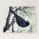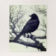 Puzzle in a black-and-white illustration featuring a sleek black crow perched on a gnarled, leafless branch. The bird's detailed feathers contrast sharply with the stark, skeletal tree limbs, creating a dramatic composition.