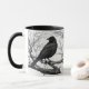 Mug in a black-and-white illustration featuring a sleek black crow perched on a gnarled, leafless branch. The bird's detailed feathers contrast sharply with the stark, skeletal tree limbs, creating a dramatic composition.